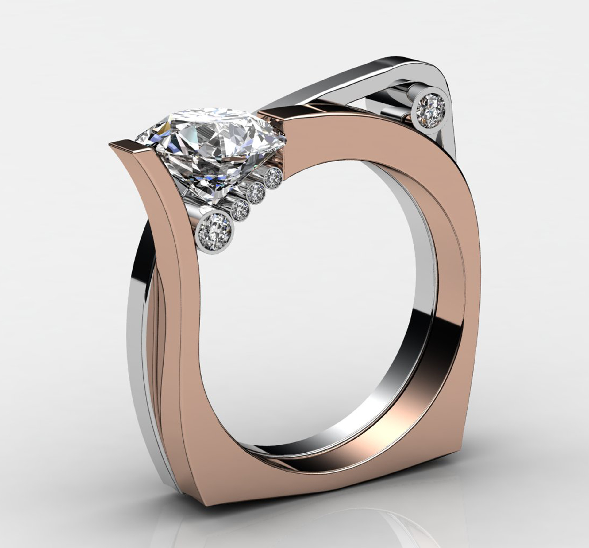 Echoes of Silence perfectly blend sophistication with modern innovation, lightness, & durabilty. Delicatly crafted in 14k white & pink gold and enhanced with a beautifully cut 2.50 ct Moisanite and accentuated with a round diamond. Moissinite is a wonderful surrogate to the diamond without the cost. Mineral moissanite was discovered by Henri Moissan while examining rock samples from a meteor crater located in Canyon Diablo, Arizona, in 1893.