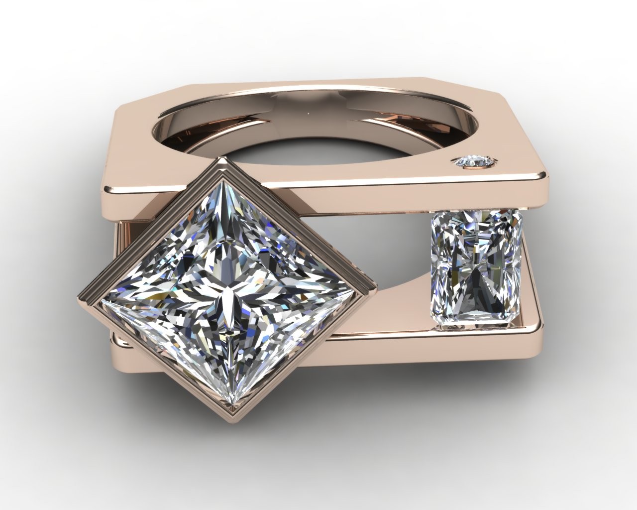 Crafted in your choice of 14k or 18k gold—available in pink, white, or yellow—Tranquil embodies balance, precision, and serenity in design. At its heart rests a commanding 4.50-carat princess-cut lab-grown diamond, perfectly complemented by 1.00 carat of radiant-cut side stones that mirror its geometric grace and fire.