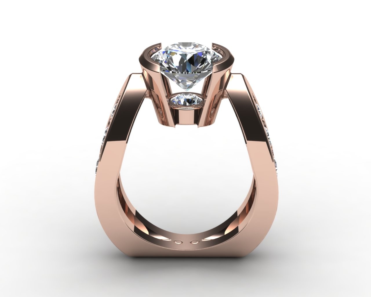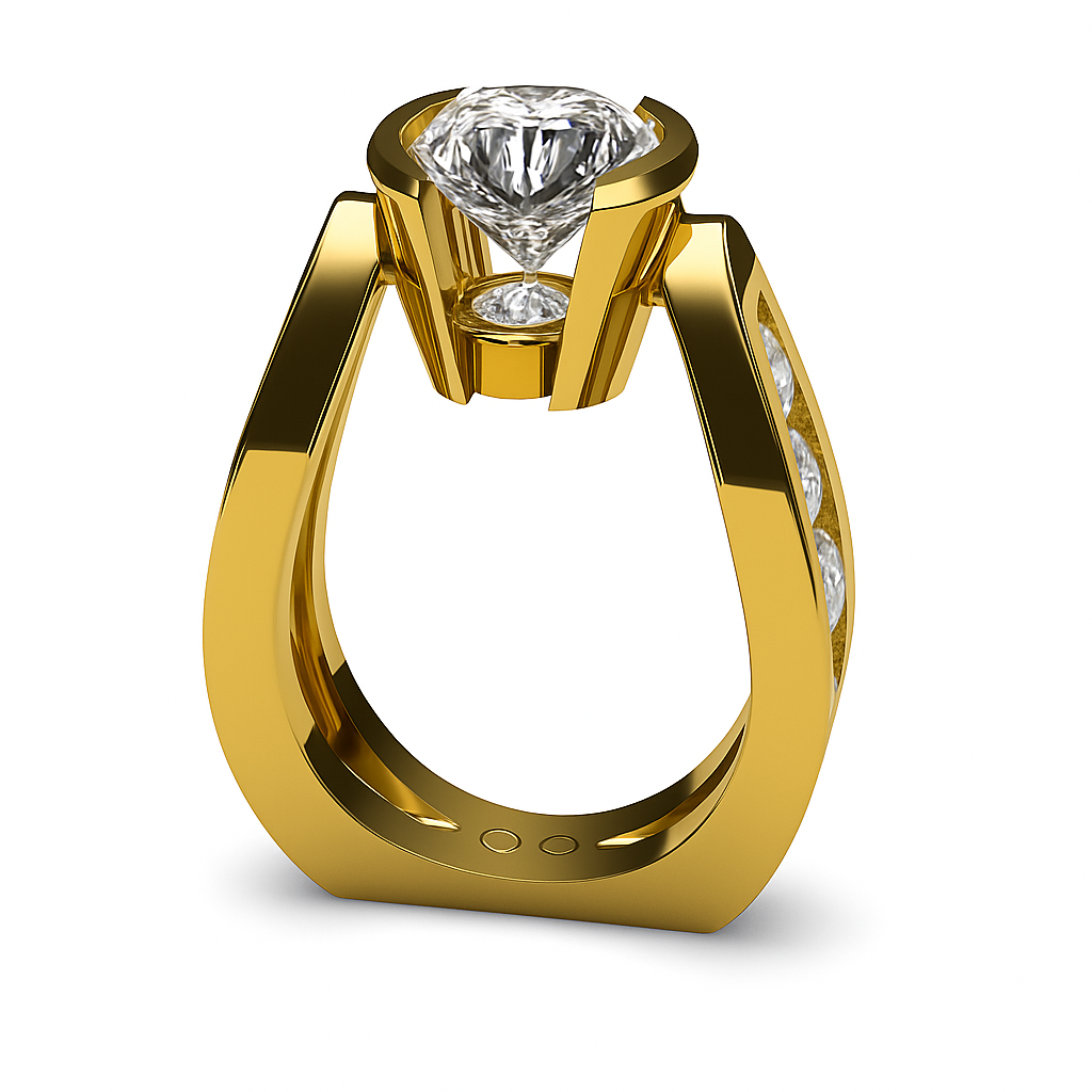 What sets this piece apart is its unique setting — elevating the diamond in a way that captures light from every angle, creating a radiant display of sparkle. Subtle accent diamonds along the band add an extra touch of refinement, while the bold gold shank offers a modern architectural feel.