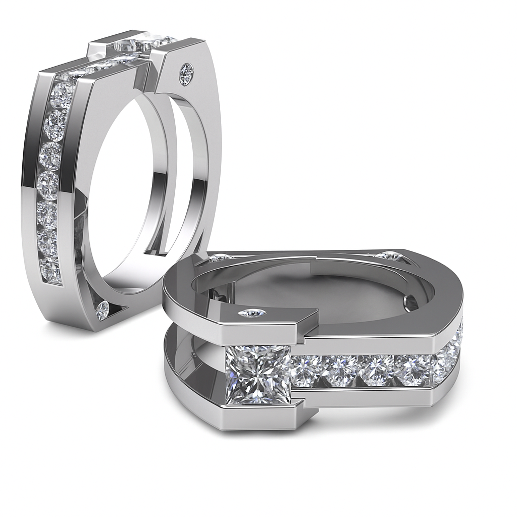 These striking wedding bands are designed as a true pair—two unique silhouettes that mirror each other in strength, balance, and harmony. The architectural lines, channel-set brilliance, and signature Harry Roa geometry reflect a love built on truth, loyalty, and integrity.