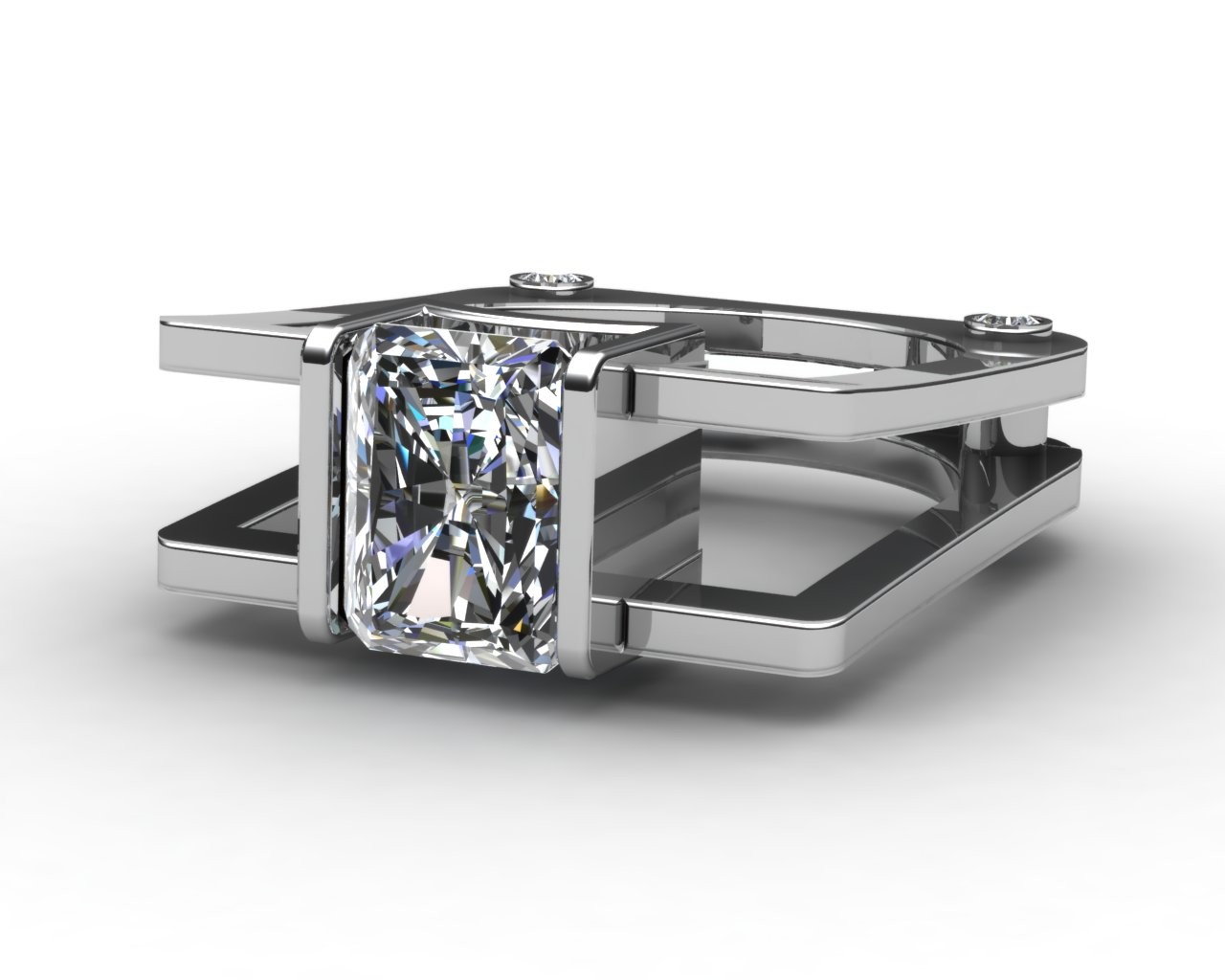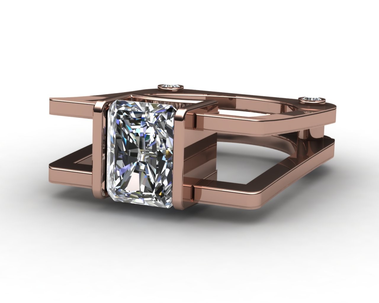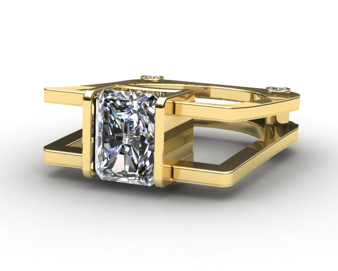 A modern marvel of sculptural precision, the Moonrise ring captures the quiet brilliance of a rising moon over still water. Its architectural silhouette—crafted in your choice of 14k or 18k gold—frames a dazzling 3.00 ct radiant-cut centerpiece, suspended elegantly between parallel lines of polished metal. Two brilliant-cut accent diamonds (0.16 ct each) illuminate the base, symbolizing balance and harmony.