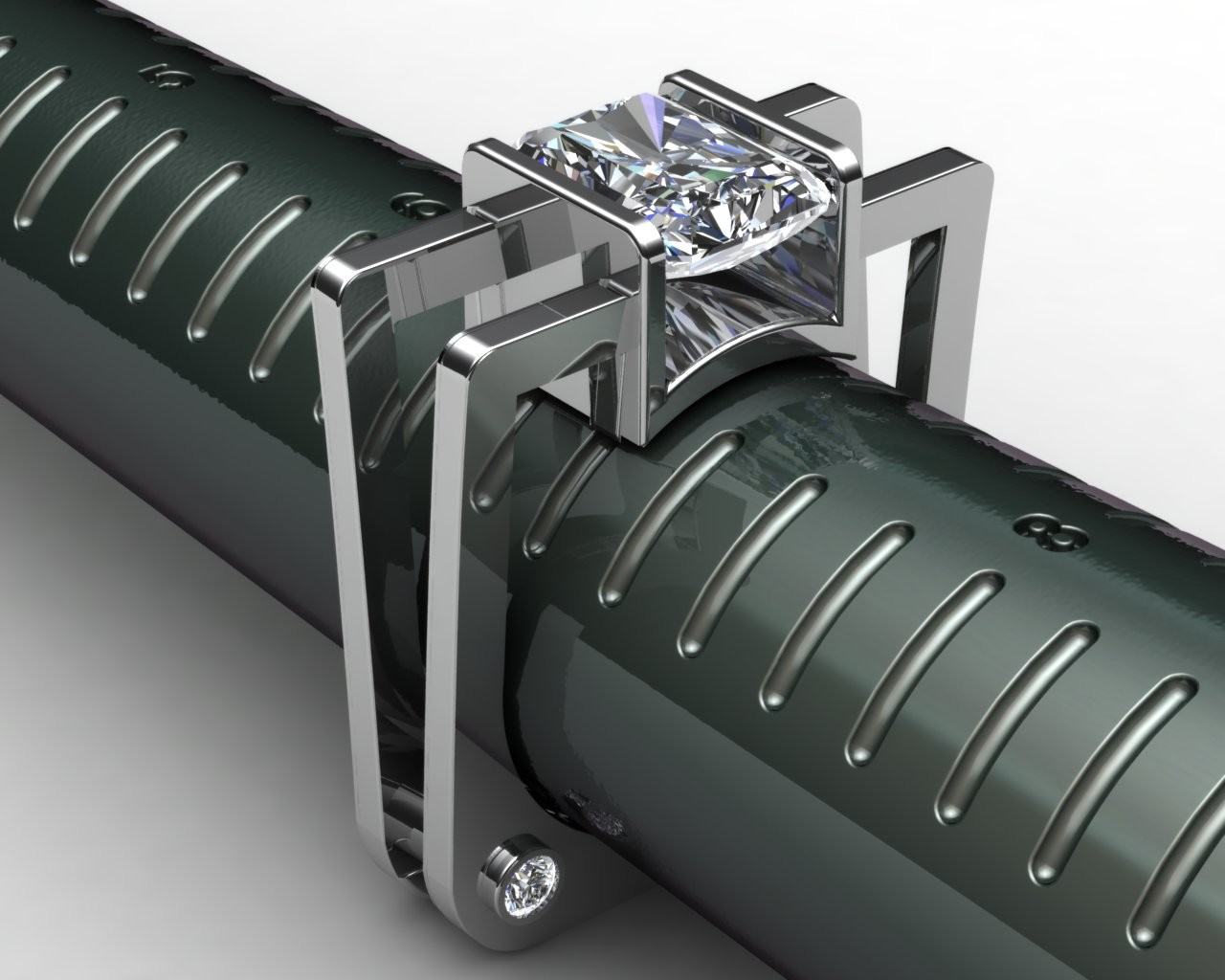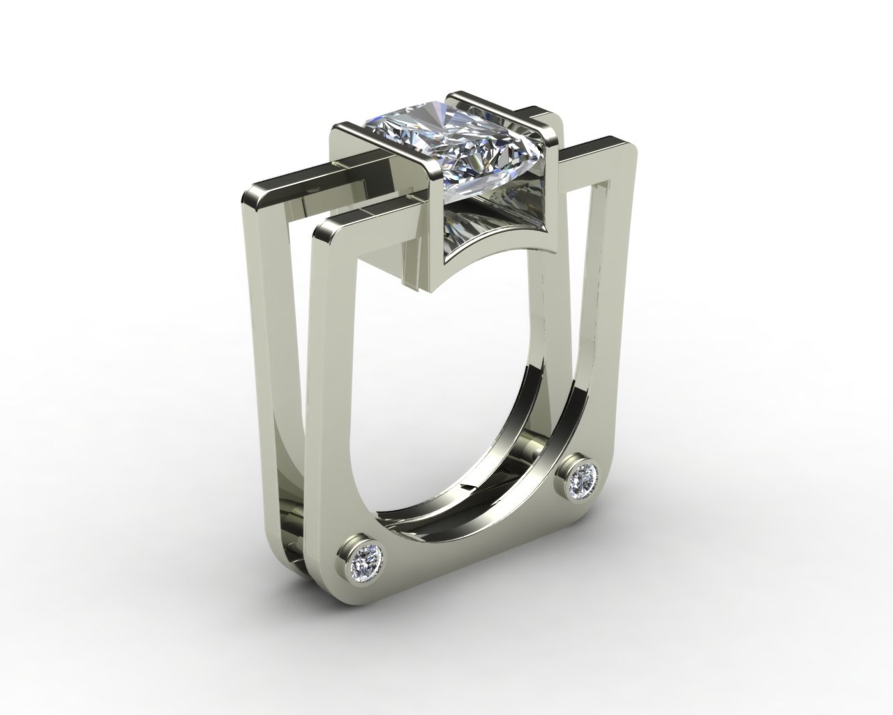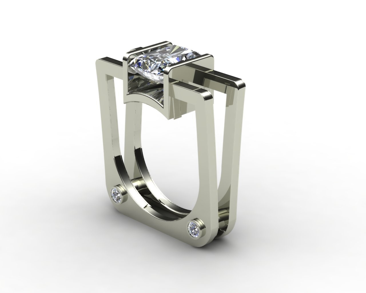 A modern marvel of sculptural precision, the Moonrise ring captures the quiet brilliance of a rising moon over still water. Its architectural silhouette—crafted in your choice of 14k or 18k gold—frames a dazzling 3.00 ct radiant-cut centerpiece, suspended elegantly between parallel lines of polished metal. Two brilliant-cut accent diamonds (0.16 ct each) illuminate the base, symbolizing balance and harmony.