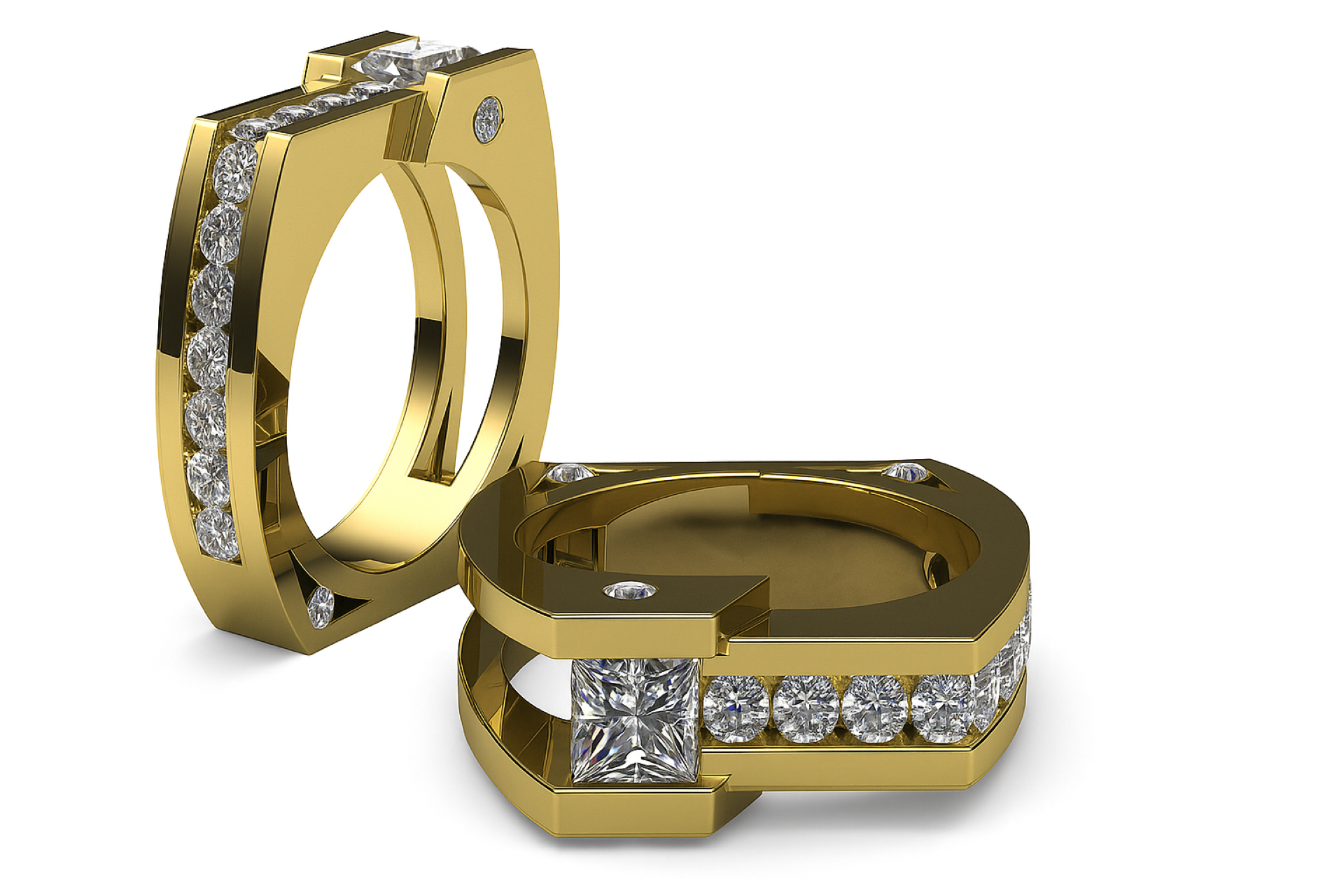 These striking wedding bands are designed as a true pair—two unique silhouettes that mirror each other in strength, balance, and harmony. The architectural lines, channel-set brilliance, and signature Harry Roa geometry reflect a love built on truth, loyalty, and integrity.