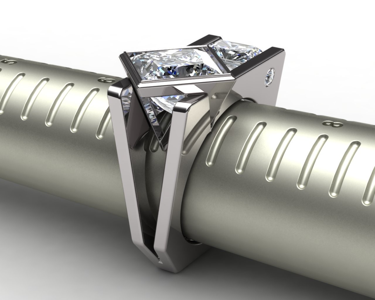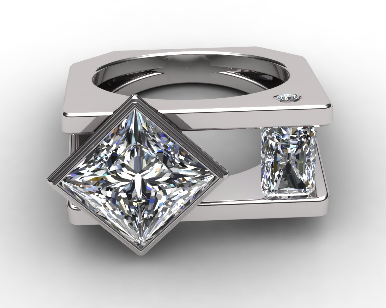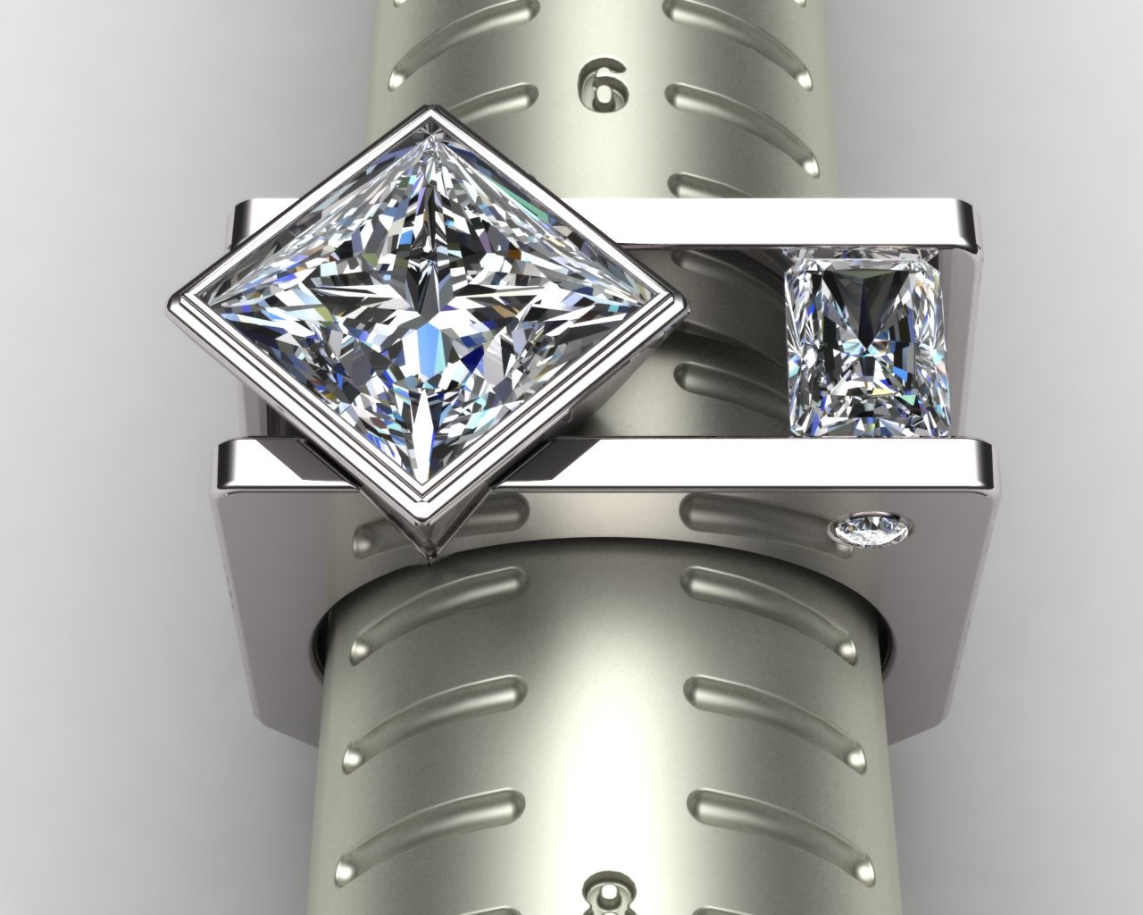 Crafted in your choice of 14k or 18k gold—available in pink, white, or yellow—Tranquil embodies balance, precision, and serenity in design. At its heart rests a commanding 4.50-carat princess-cut lab-grown diamond, perfectly complemented by 1.00 carat of radiant-cut side stones that mirror its geometric grace and fire.