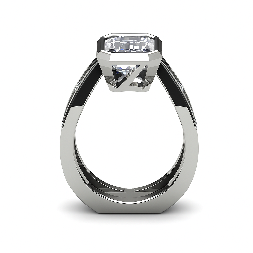 The diamond, elevated in a striking modern setting, seems to rise effortlessly from the band, catching the light with every movement. Subtle curves and clean lines create harmony between strength and softness, making the piece as symbolic as it is stunning.